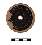 Description:   Kylix base with black glaze. Some red lines. Inscribed on bottom. Chipped at rim but name is legible.