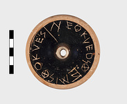 | Description: | Kylix base with black glaze. Some red lines on top. Inscribed on bottom. | |