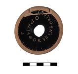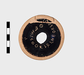 | Description: | Kylix base with black glaze. Inscribed on the bottom. Chipped on one edge and last two letters ΟΣ are missing. | |