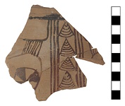 | Description: | Brown on buff, line, triangles etc. Cf. AP 1080b. ADDENDA 2018: Three joining sherds of a medium krater. No other features preserved. The exterior features a double band at the rim and panelled decoration in the handle zone consisting of a central triglyph filled with papyrus motif flanked by antithetic spirals with rosettes substituted for the spiral. The interior has at least one medium band at the rim, but is otherwise undecorated. The paint is thick and evenly applied, fired dark brown to black. There are no traces of use-wear or burning. Furumark Shape: 281; Furumark Motif 1: 75; Furumark Motif 2: 11; Furumark Motif 3: 50; Furumark Motif 4: 17 | |
