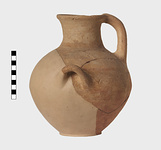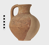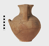 | Description: | Mycenaean hydria with only one horizontal handle and the vertical handle. Fragmentary. Single horizontal red bands at base of neck, above and below horizontal handle. Coarse buff clay fired pink in spots. ADDENDA 2018: Thirteen sherds mended into the complete profile of a small hydria, with flaring rounded rim with hollowed lip, a vertical, oval-section handle, only one, horizontal round-section handle, and a flat raised base. The exterior decoration consists of a medium lip-band, a medium band at the junction of the neck and shoulder, a medium band running below the vertical handle and above the horizontal handle, three(?) medium bands running below the horizontal handle, and a medium band at the junction of the band and the body. The base of the handle is outlined with a medium band, but the exterior of the handle is too worn to make out any decoration. The vessel shows fairly extreme wear on the lower body and on the vertical handle. This would not be inconsistent with regular lowering into water with a rope. There are no traces of burning. Furumark Shape: 128 | |