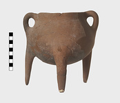| Description: | Mycenaean cooking vessel, coarse gray brown ware. ADDENDA 2018: Twelve sherds mended into the complete profile of a small tripod cooking pot with vertical, round section handle, collar-neck with slightly flaring rim, and two preserved feet. The one foot exhibits traces of burnt fatigue. The entire lower bowl and legs show burn marks from contact with coals. Furumark Shape: 310 | |