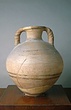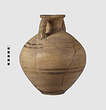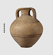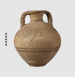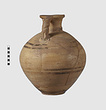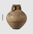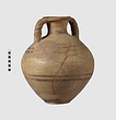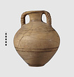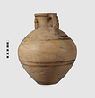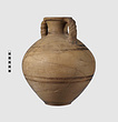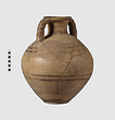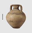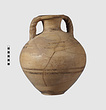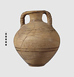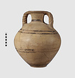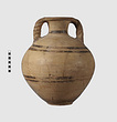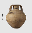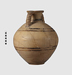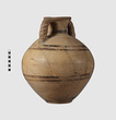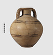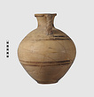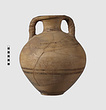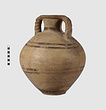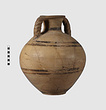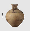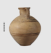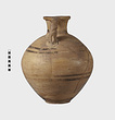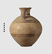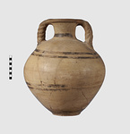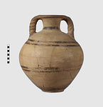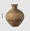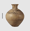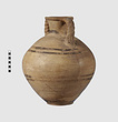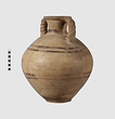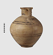 Glazed band about neck attachment and foot. Two double concentric rings above and below the middle of the vase.