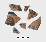 | Description: | Several fragments of a black figured vase with two warriors playing drafts, helmets on ground beside them. | |