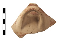 Description:   Handle of Mycenaean vase, with a part of the rim. Bands of brown paint and some looped design form the decoration. Inside covered with red.
