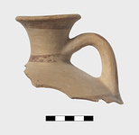 Description:   Neck and handle of a Mycenaean vase. Yellow clay, pal. Bands of brown paint around the lip, around the neck where it rises from the body, around the body below the handle, and down the handle in a wavy line form, the only decoration.
