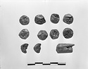 | Description: | Eleven pieces cut from a rod. One of these is the remnant of the rod, become to short for further cutting. Eight pieces are "normal", two are scraps. The cutting was done with a chisel anywhere from one to four blows to the cut (waste from making coins? Is poros building the mint - ΑΡΓΥΡΟΚΟΠΕΙΟΝ ?) | |
