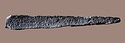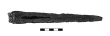 | Description: | Partly disintegrated on one side. Each of four sides concave, three are inscribed. Butt tapers at one end, hole for insertion of spear shaft on other. Bronze(?) | |