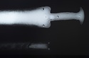 Blade tapers slightly to rounded blunt tip. Straight hilt ends in a flat pommel with rounded ends. Hilt and upper blade edged by flange.
