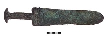 Description:   Complete dagger. Well preserved, with slight corrosion. Three bronze rivets preserved along handle with three studs still in place, and three rivets on top area of blade.