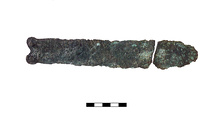 | Description: | Complete. Mended from three fragments. Corroded and cracked. Wide blade, tapering at handle end, wider at rounded tip. At handle end, two rounded protuberances edged with tiny flange. Two rivet studs for attachment of handle. | |