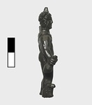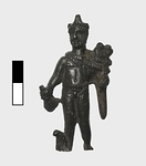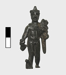 | Description: | Hermes stands facing, on a small concave sided base. He is nude save for a twist of drapery around his shoulders. In his right hand he carries a small bag, in his left a daduceus. On his head is a small pointed cap. Animal at feet (Ram ?). Base missing (3/19/58, 9/2000). | |
