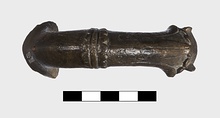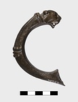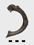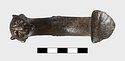 | Description: | Handle, triangular in section. Sharply curved and worked with petals and scalloped tie-band around the middle. The top ends in a lion 's head; the other end was fitted to a small curved object, probably a lamp. Small hole drilled in undersite for setting on base. | |