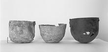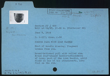 | Description: | Most of handle missing; fragment broken from rim. Round-bottomed pail with rolled rim. Broad leaf-shaped handle-attachments of iron; part of the iron handle, still fixed in one of the attachments, lies flat on the rim. | |