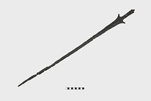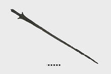 | Description: | Broken in five pieces but complete. Heavy rib down center of blade. A raised rim around the edge of the handle to take the (wooden ?) hand-hold. One rivet for fastening on hand-hold in place, and traces of holes for at least three others. Rivet heads : cf. B 779 and J 99 (ΔΔ 177 and 180). At ca. 0.13m. from the tip, a heavy rivet with a gold rimmed head, apparently attached to the blade by corrosion. | |