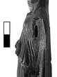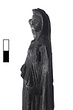 | Description: | High circular base with elaborately moulded double conical profile. Standing figure with weight on left leg, right leg bent and drawn back. She wears Doric chiton with overfold and kolpos, a stephane and a cloak drawn up over the back of her head like a veil. The cloak falls in a loop of drapery over either shoulder; its heavy folds frame the figure and cover it to below the knees at the back. The figure 's right arm is raised, the elbow bent, the fingers lightly clasped to hold some object now missing; traces of attachment along inside of upper arm (scepter, torch ?). The left hand holds a long slender cornucopia, topped with fruits and with a large crescent. This arm was made separately and attached, and had become separated from the figure, when found. In the top of the head, just behind the stephane is a small pin hole. A few chips missing from the base. The surface on the upper right leg somewhat corroded, but the condition in general excellent. | |