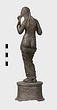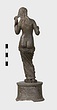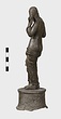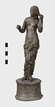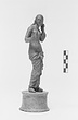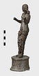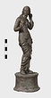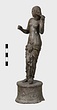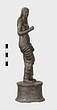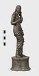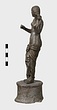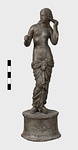 | Description: | Circular base, lightly moulded above and below. Standing figure, the right leg slightly bent. The figure is partly draped, with the cloak wrapped round her thighs, its bunched folds falling in front. She wears substantial sandals. Her hair rolled back from her face, falls loose over her shoulders behind; one lock is held out in her raised left hand. Her head is turned to her right, towards her extended right hand, which held some object, doubtless the mirror in which she is arranging her hair. Surface considerably eaten by the corrosion. | |