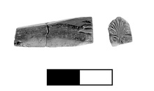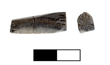 | Description: | Mended from two fragments, broken at one end. Burnt bone discolored black and white and cracked. Length of bone, roughly square in section, slightly flaring at preserved end with palmette stamp carved into it. Stamp is slightly off the long vertical axis. Palmette with seven petals springing from two volutes. Carved end is crisp and well-preserved. | |
