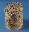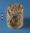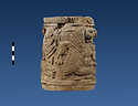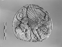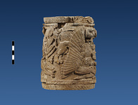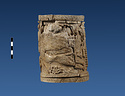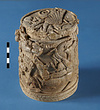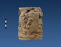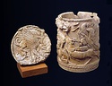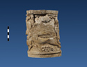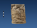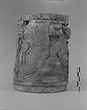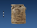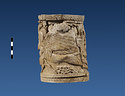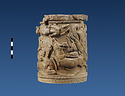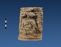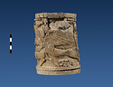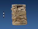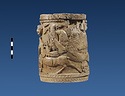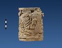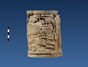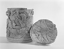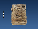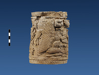 | Description: | Broken and split into many pieces, but largely complete; one side slightly higher than the other. A cylindrical box, tapering very slightly toward the top. The flat lid is held in place by a projecting central disk which fits down inside the wall. The bottom is made in two superimposed parts, one providing the actual floor of the box, the other, fastened to the first by ivory pegs, is a separate piece which provides a base for the whole. Traces of a metal lining, analyzed as tin, were found inside the box. The carved decoration, in fairly high relief, shows, on the lid, a griffin, crested, right, tearing two small deer. On the wall two similar griffins are represented at a larger scale, one right, the other left; they also are attacking deer both large and small. Considerably indications of a landscape backround. Close under the rim, two (?) horizontal lug-like handles, long, and slightly projecting, formed by the bodies of crouching animals; one of these fairly complete, the other fragmentary. Probably two pairs each formed by a lion and a deer. Pierced vertically. Border decoration at top and bottom, two zones of incised S-curved lines. | |