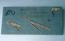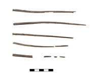 | Description: | The "set" consists of one complete pin, two good-sized fragments of others, and five scraps. The complete pin and the two large fragments are each mended from several pieces. Each consists of a plain tapering shaft, round in section, and somewhat curved or bent, and cut off straight at the thick end. | |