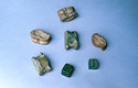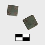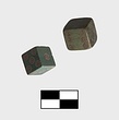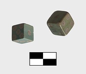 | Description: | Spots consist of two incised concentric circles around central incised point. On the end of each die (ends as regards graining of bone) are the spots three and four; On the other four faces in sucession are one, two, six, five. Bone bluish green with much sharper edges. Similar to BI 539 a and 539 b and 542 a. | |