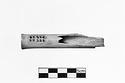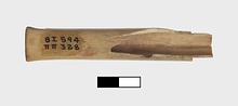 | Description: | Part of one side broken away; the length of the section complete. One end oval, with a tapering groove along one face. Apparently the mouth-piece, since only the opposite end is flanged to take another section. Probably section of a salpinx (trumpet); J. Neils and N. Xanthoulis - ancient salpinx specialist 25/6/12. Bone; checked by J. Unruh 2001. | |