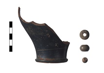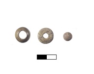 | Description: | Globular bead with very large perforation; possibly intended for use around a shaft of pin or the like rather than as a bead. Bone well polished or worn; stained brown. | |