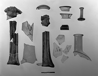 | Description: | Parts of neck, mouth and handles preserved. The many fragments make up into two groups (kept as four because of fragility of joins). Fragment a) ca. 3/4 of mouth with some of neck, one flat handle (fragments missing but complete height preserved) and the attachment of the other. Fragment b) the lower part of the other flat handle and a considerable amount of the neck. The handles rise a centimetre or so above the mouth. The neck is made of plain transparent glass. The handles are rather roughly made of opaque blue glass. | |