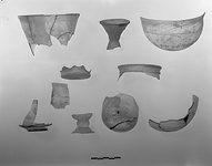| Description: | Central part of foot and part of bottom of bowl are preserved, together with connecting stem. A broad low base, hollow underneath, is separated from the convex floor of the bowl by a solid rounded bead which forms the stem. The glass, fairly thick as far as preserved, has a slight greenish tint. | |