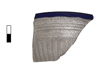 | Description: | Fragment from rim and upper body of a bowl shaped like a Megarian bowl. Ribbed body; grooved rim. The lip is of dark blue glass, added separately. The bowl itself is of colorless glass. | |