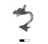 | Description: | Complete handle, with part of rim. A vertical strap handle, with projecting flange just above lower attachment and two knobs and vertical flange on rim. Greenish blue glass. | |