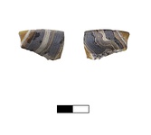 | Description: | Fragment from flaring rim. Moulded glass; marbled in streaks of brown, yellow, white and blue. | |