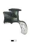 | Description: | Rim, neck, handle and part of one side of square body preserved. Straight neck, flat projecting lip, wide grooved handle. Pale greenish glass. Moulded (?) | |