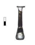 | Description: | Chips missing from bottom and from lip. Small body with flat bottom; tall tapering neck and flaring round rim. Greenish blue glass. | |