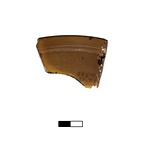 | Description: | Rim fragment from a heavy bowl with plain vertical lip. A groove below the lip inside. Dark brown glass. | |