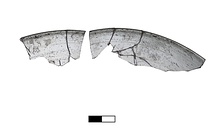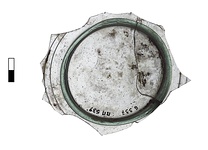 | Description: | The floor and the bottom with ring base preserved. Also a non-joining part of the rim and a fragment from the body preserved. Somewhat out of shape. Flat profile. Slight rise in middle of bottom. Thin thread of same glass wound around, beginning outside base and apparently going up to rim. Spirals and bubbles. Enamel weathering. Bluish-green glass. Foot and thickened rounded rim similar to G 357. | |