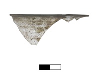| Description: | Most of rim and part of walls preserved. Broad flaring rim, thickened and rounded. Bubbles and spirals. Enamel weathering. Very pale green glass. | |