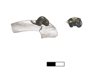 | Description: | Fragment a): from angular shoulder, with small handle twisted back on itself on shoulder. Fragment b) scrap with similar handle. Very thin bluish glass. | |