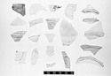 | Description: | 28 fragments, non joining, probably from two different plates or one oval (?) plate. Fragment: a) part of horizontal rim preserved. Groove in top of rim. Rim widens toward right side of piece as if approaching a missing handle. b) and c) are pieces from floor. d), e), f), g), h) are fragments from base ring. i) fragment of center floor with three concentric engraved circles. j), k), l) fragments from rim with curving wall. Horizontal groove just below rim. There are also 16 flat fragments of floor of plate, three of them with traces of base. Colorless slightly opaque glass. | |