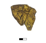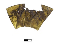 | Description: | Mended from many pieces. Grooved below rim on the inside. Brown iridescent molded glass; white incrustation. | |