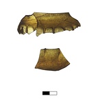 | Description: | From an open bowl with flaring rim. Below rim outside, shallow parallel grooves; ribs in relief on body. Brownish amber, somewhat iridescent. | |