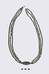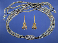 | Description: | Intact, with some chips from one end. Surface crumbly. Pierced lengthwise. At one end, a ring of white leading into seven columns of scallops. Porous white decoration. Dull green glass. Part of necklace with G 588-591 and J 149. Early Geometric. | |
