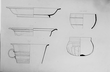 | Description: | The side of a bowl preserved. Bowl with straight lip, decorated with grooves around the body. Blue green glass. | |