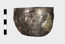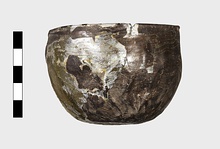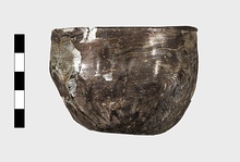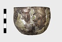 Broken in vitrine and mended (with Paraloid B72) resulting in substantial hole in the side. Not known when these fragments were lost (18 December 1985).