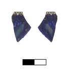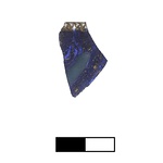 | Description: | Rim fragment of millefiori bowl. Deep-bowled form, curving up to a vertical rim. Mainly translucent blue (series of segments of rods with decayed whitish centers) and an inset turquoise-ivory strip. Colorless rim-band with yellow spiral thread. | |