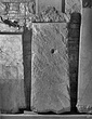 Broken away below; the lettered face much worn; in its middle the worn socket for a door pivot.