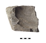 | Description: | Fragment of inscribed marble basin (?). On the upper surface part of a circular smooth worn concavity; at a little more than right angles to the edge of this, inscribed surface which seems to come forward to some sort of convex moulding now broken away at bottom. Hymettian marble. | |