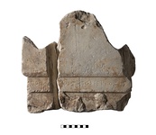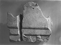 | Description: | Upper part of inscribed grave relief. Mended from two fragments found on different dates. The smaller left piece was found first; the two fragments do not meet along front edge; may have been cut apart. The damaged top of the stele was roughly pedimental with side finials and rounded center; upper surface picked. The sides are finished with a toothed chisel, the back rough picked. Along the lower edge is preserved the top of a relief: bearded man faces left towards a horse and rider (?) in broad-brimmed hat; above these heads a projecting band, inscribed. Pentelic marble. | |