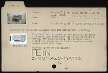 | Description: | Fragment of inscribed columnar base for dedication. Front and left surfaces of the capital preserved, of abacus from corner for distances indicated by "W" and "T" measurements. Top surface rough picked and preserves part of a roughly circular socket. Inscribed on front and on abacus. Pentelic marble. | |