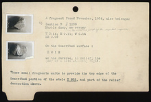 | Description: | Fragments from upper part of inscribed stele with relief above. Fragment Δ 75 a), broken all around save front and back. The better preserved surface shows legs and feet apart of frontal figure standing on frame (upper surface slopes to the spectator). Outer surface of frame projects a little beyond surface below, of which a small piece is preserved. Frame also shows traces of letters. A small piece of the back surface of the stele (face B) at the level of the legs on front is preserved. Inscribed. Fragment Β 1039 b), has on the inscribed surface: "Σ Ο Ι Ε". On the reverse, in relief, the body of a bird standing right. Fragment Ζ 672 c), part of stele inscribed on two opposite faces; sculptured relief above face A. Pentelic marble. ADDENDA Joined with I 203b. These small fragments unite to provide the top edge of the inscribed portion of the stele I 932 (Ζ 672), and part of the relief decoration above. Four joining fragments of an opisthographic stele. Parts of the right side (of face A) and of the bottom (with tenon) are preserved. Face B (Agora XV, no. 359), was cut on the reverse side of the same stele. Cf. Ι 932. Addenda Joined to I 932. | |